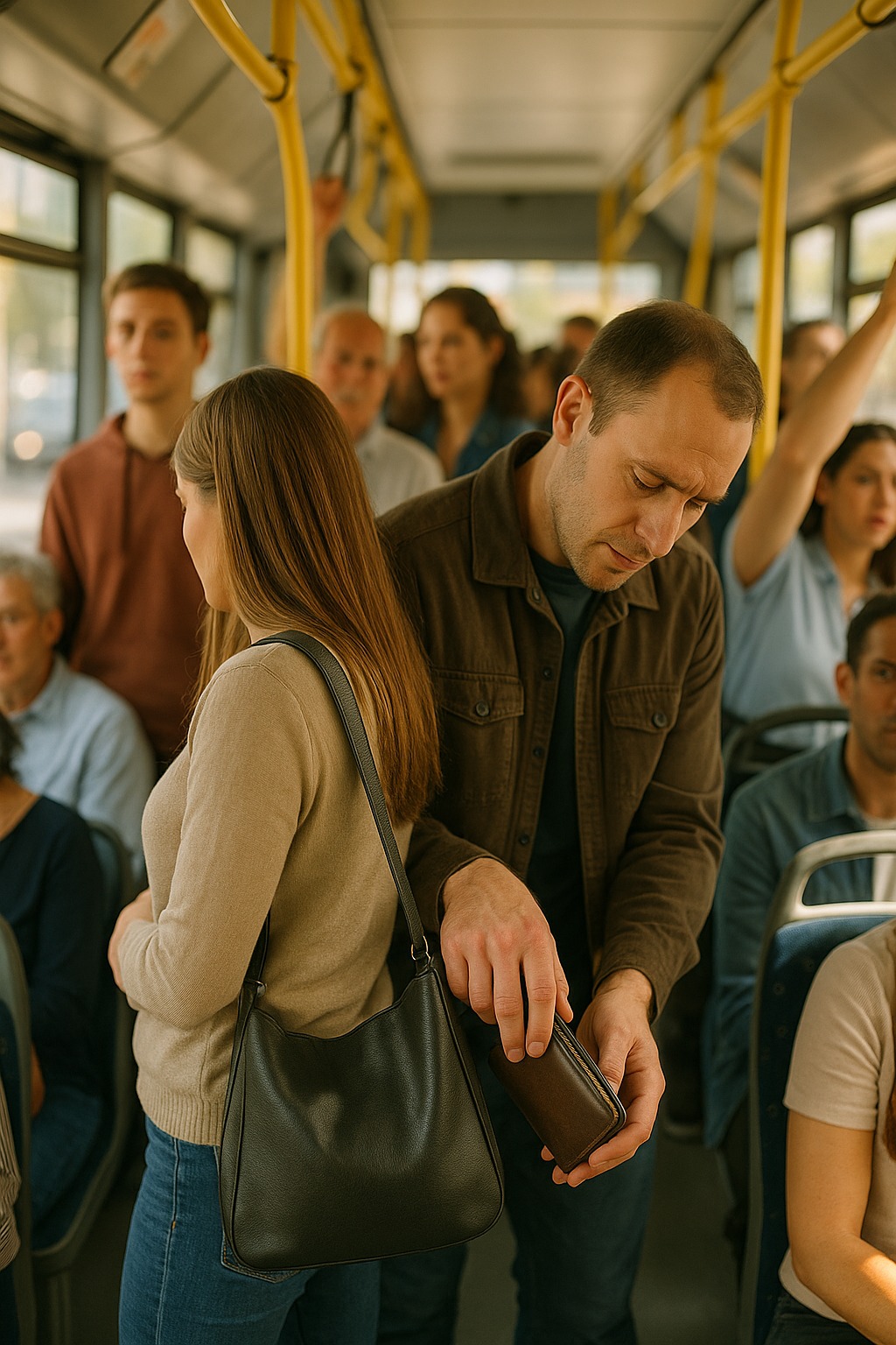 Njena torba se malo otvorila. Rajsferšlus je polako skliznuo. Muškarac je pažljivo, tiho, kao da to nije ništa važno, uzeo njen novčanik. Žena nije primetila ništa. Ali, jedan mladić, oko dvadeset godina, sa slušalicama oko vrata, stajao je sa strane i sve primetio. Video je ruku koja je klizila kroz torbu, kako se otvara rajsferšlus i kako novčanik nestaje.