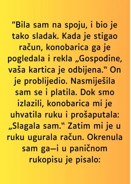 - Dok smo izlazili iz restorana, konobarica je, prije nego što smo prošli kroz vrata, iznenada zgrabila moju ruku. Prišla mi je vrlo blizu i šaptom rekla: „Slagala sam.“ Moje srce je stalo na trenutak, a ona mi je tada brzo ugurala račun u ruku. Zbunjena i preplašena, okrenula sam račun, a na njemu je bio rukopis, kao da je pisan pod panikom: „Pretraži ga na Googleu.“ Srce mi je počelo brže kucati, a ruke su mi zadrhtale od straha. Nema sumnje da nisam imala pojma o tome što se događa, ali nisam mogla da ignorišem osjećaj nelagode.