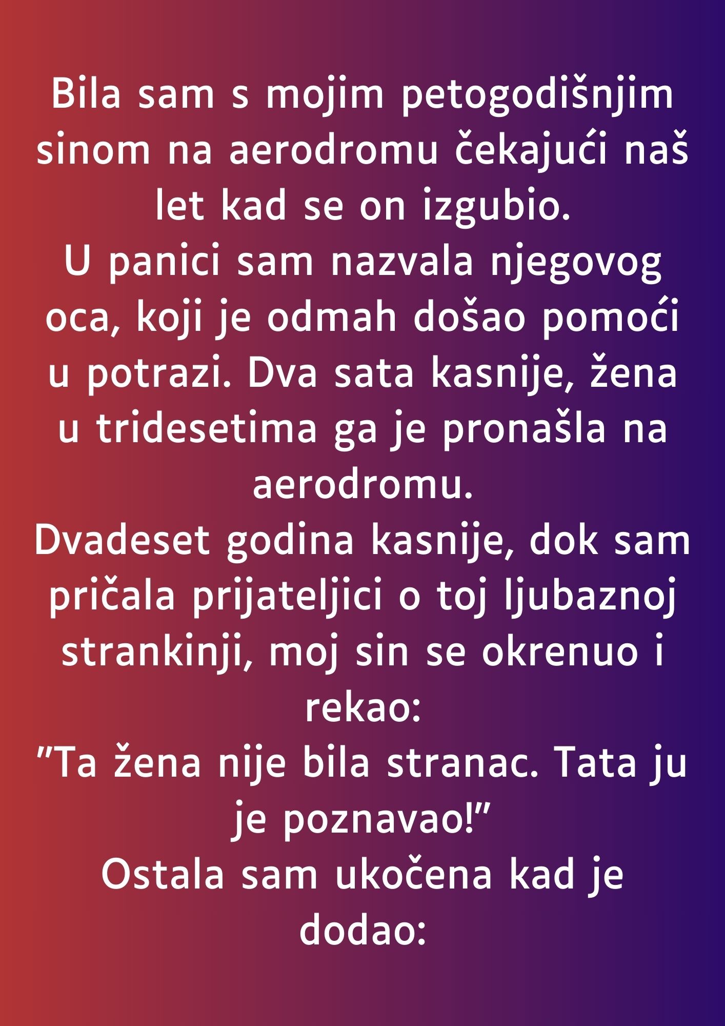 - Desetljeća kasnije, tokom razgovora sa prijateljicom o tom trenutku, njen sin se okrenuo prema njoj i priznao nešto što ju je potpuno šokiralo. “Ta žena nije bila neki stranac. Tata je nju znao…” rekao je sin, ostavljajući majku u potpunom šoku. Iako nije mogla odmah da shvati o čemu se radi, sin je nastavio: “Tog dana se nisam izgubio. Tata me je tada uzeo, a ona me je čekala na aerodromu sa dva kofera – jedan za nju, drugi za njega. Planirali su tada da pobegnu sa mnom.”
