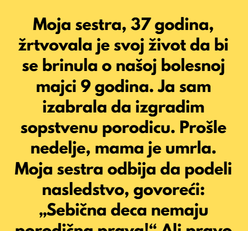 Sestra je zrtvovala 9 godina svog zivota da bi se brinula o bolesnoj majci a ja sada ne zelim se odreci nasljedstva jer nisam...