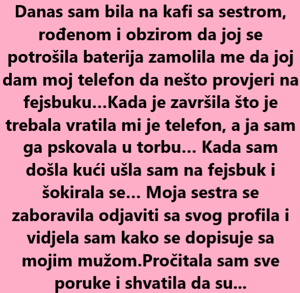 - Međutim, kada sam se kasnije vratila kući, sve je postalo sasvim drugačije. Odlučila sam da otvorim svoj Facebook, kao i obično, ali umesto svog profila, pred očima mi se pojavio profil moje sestre. Na trenutak me je to zbunilo, ali sam pomislila da je samo zaboravila da se odjavi sa svog naloga. U prvom trenutku to mi je bilo simpatično, pa sam planirala samo da se odjavim i nastavim dalje. Ali, nešto je u meni proradilo, neka vrsta znatiželje koja me je naterala da pogledam njene poruke.
