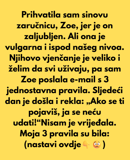 Međutim, reakcija buduće snahe bila je potpuno suprotna od onoga što sam očekivala. Njezino lice postalo je ozbiljno, a u očima sam mogla vidjeti povrijeđenost, a zatim i bijes. Optužila me da se miješam u njihove odluke, da pokušavam kontrolirati njeno vjenčanje i da ne poštujem njenu ulogu buduće supruge. Rekla mi je da to nije moja stvar i da nemam pravo postavljati bilo kakva pravila.