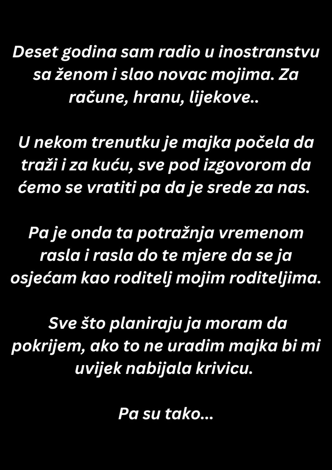 - Svi su imali neki zahtev ili plan koji sam morao da isfinansiram. Ako nisam mogao da odgovorim na njihove zahteve, majka bi mi odmah nabijala krivicu, i uvek bi bilo da nisam dovoljno posvećen porodici, da nisam dovoljno pomogao. Onda su počeli da kupuju stvari koje nisu bile nužne. Kupili su auto, išli na letovanje, platili mojoj sestri njen odmor. I svaki put kad je to činila, bilo je sve teže da se ne posvađam sa ženom. Naša komunikacija je postajala sve teža, jer se nisam slagao sa tim šta se dešava, ali nisam znao kako da zaustavim sve te zahteve.