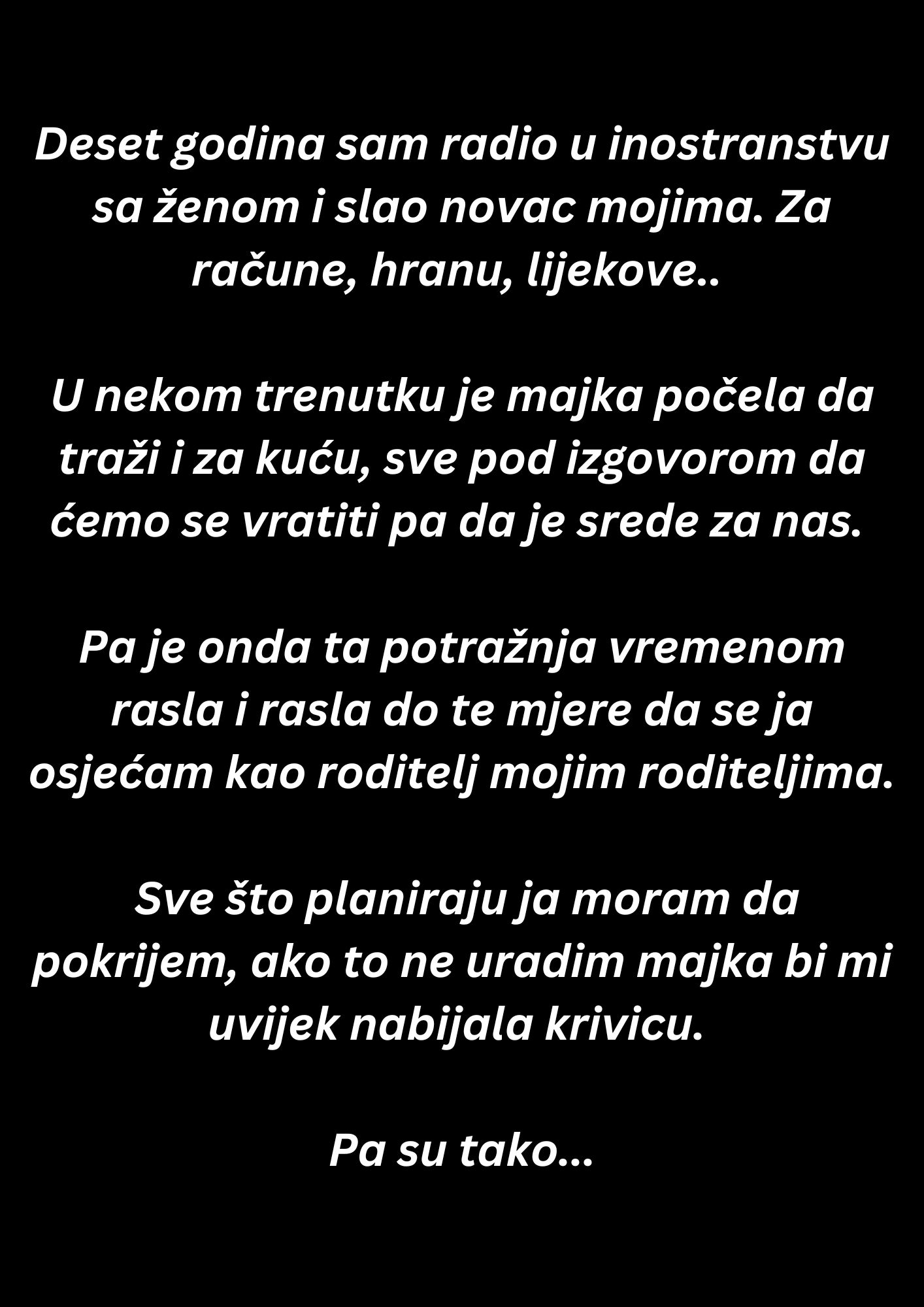 Ni jedan euro više neće otići za te iste ljude koji su me samo koristili, dok su istovremeno ignorisali moje potrebe i moj trud. Dovoljno je bilo. Neću im više biti „bankomat“, neću više biti osoba koja mora da pokriva sve njihove troškove, bez obzira na to koliko truda ulažem u život.