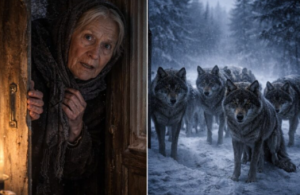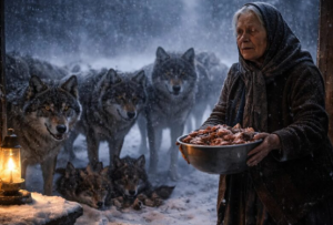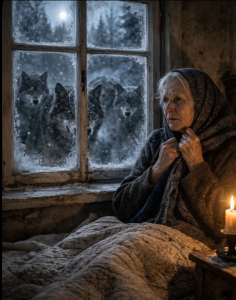 - Instinkt je govorio starici da nešto nije u redu. Iako je provodila godine u ovoj divljini i znala je kako reagirati na razne prijetnje iz prirode, sada je osjećala da se nešto značajno događa. Bez oklijevanja je prišla prozoru i, pomičući ruku prema maloj rupi, pogledala van. Na snijegu, pod mjesecinom, stajale su tamne figure — devet vukova, smirenih i tihih, okrenutih prema kući. Nisu trčali, nisu režali, nisu pokušavali ništa — jednostavno su stajali, gledajući je, kao da su čekali nešto. Njihove oči su svijetlile žutom bojom, poput plamena, što je bilo nešto neobično, jer vukovi inače ne pokazuju toliku mirnoću u takvim situacijama.