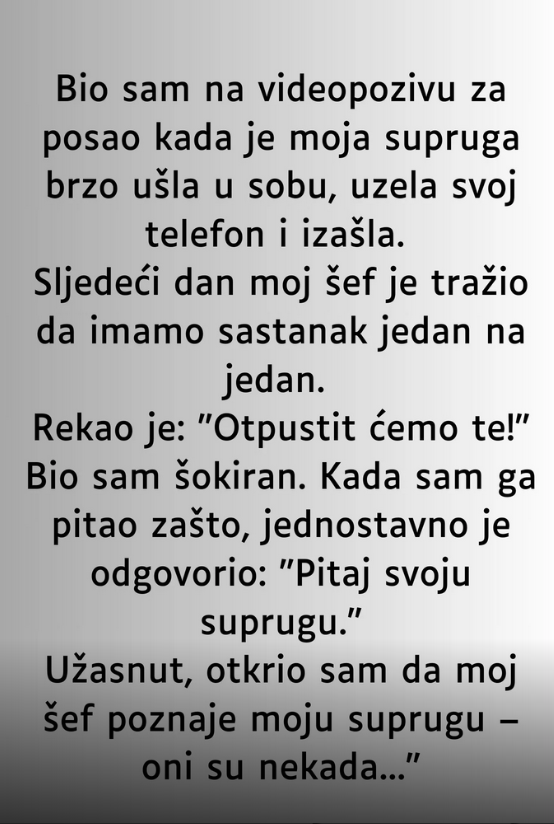 Sledećeg dana moj šef je iznenada zatražio sastanak sa mnom, i to razgovor jedan na jedan. Bio sam potpuno zatečen njegovim pozivom, jer ništa nije nagoveštavalo da bi moglo da dođe do nečega neuobičajenog. Kada sam seo preko puta njega, izgovorio je rečenicu koja mi je odzvanjala u glavi: “Otpustićemo te.” Reči su me pogodile kao hladan tuš. Bio sam u neverici, potpuno šokiran i zatečen. Nisam mogao da shvatim šta se dešava niti zbog čega sam zaslužio takvu odluku. Pokušao sam da pronađem objašnjenje i upitao ga za razlog. On me je pogledao i tiho rekao: “Za to bi trebalo da pitaš svoju suprugu…”