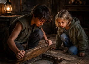 Advokat je stajao ispred kuće, u elegantnom kaputu, sa starim ključevima u rukama, koji su imali veće značenje nego što su to mogli zamisliti. Kada su ušli, ništa ih nije moglo pripremiti na ono što su pronašli. Kuća nije bila samo dom njihove bake; ona je bila mesto koje im je promenilo život. Tokom njihovog istraživanja, Aleks je primetio da se jedna daska u podu pomera, kao da je već bila podizana. Njegovi pokreti su bili spori, ali odlučni dok je podizao dasku i otkrivao metalni sanduk ispod nje.