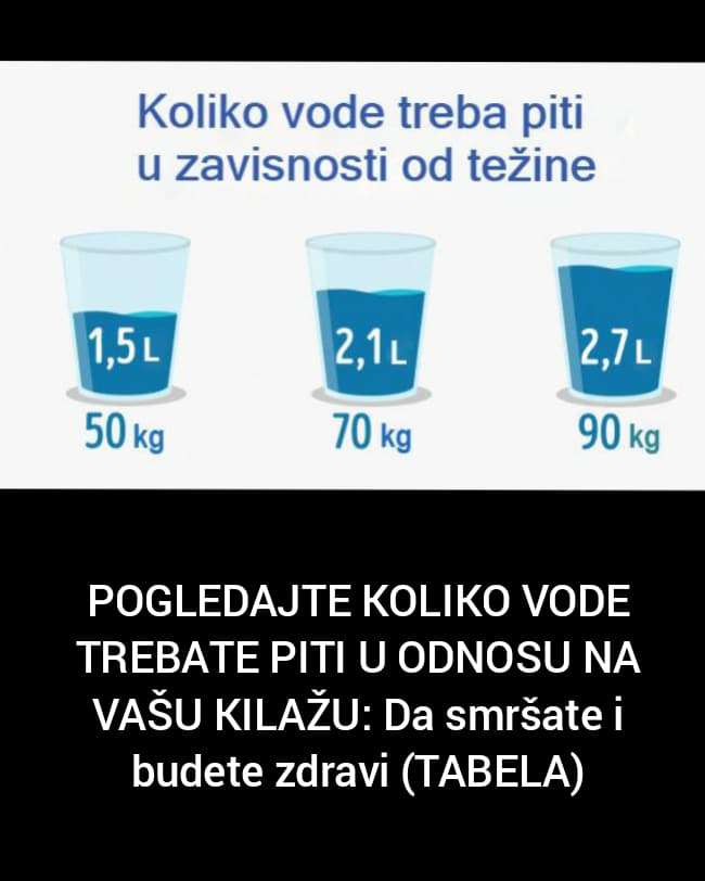 U ovom članku Vam donosimo precizne mjere o tome koliko vode treba da pijete svakog dana, u zavisnosti od Vaše telesne težine. U nastavku saznajte detaljnu tabelu koja će Vam pomoći da pravilno hidrirate organizam i održite zdravlje…