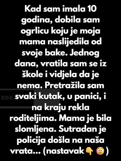 Jednog dana, nakon škole, vratila sam se kući, ali ogrlica nije bila tamo gde je obično bila — na stolu u spavaćoj sobi moje mame. Panika me obuzela. Počela sam da tražim svuda po stanu, pod kreveta, u ormarima, čak i u kutijama sa stvarima koje nisam koristila. Srce mi je bilo u grlu, a ruke su mi drhtale dok sam pretraživala svaki kutak. Mislila sam da je možda neko ušao u kuću i ukrao je. Povikala sam na roditelje, i svi su zajedno počeli da pretražuju kuću. Mama je bila vidno uznemirena, a ja nisam znala šta da radim, samo sam gledala kako ona postepeno gubi nadu.