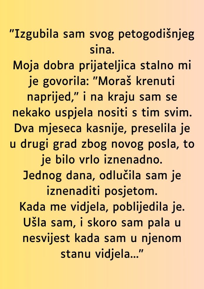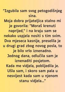 Majka, koja je nedavno izgubila svog petogodišnjeg sina, bila je suočena s tugom i gubitkom na način koji nijedna osoba ne može potpuno razumjeti. Nakon toga, njezina dobra prijateljica stalno joj je govorila: “Moraš krenuti naprijed”, što je bila jedina utjeha koju je mogla dobiti. No, unatoč svim savjetima, osjećala je kako joj je život ostao zamrznut u trenutku gubitka. Dva mjeseca kasnije, njezina prijateljica preselila se u drugi grad zbog novog posla, što je za nju bilo iznenadno i neočekivano.