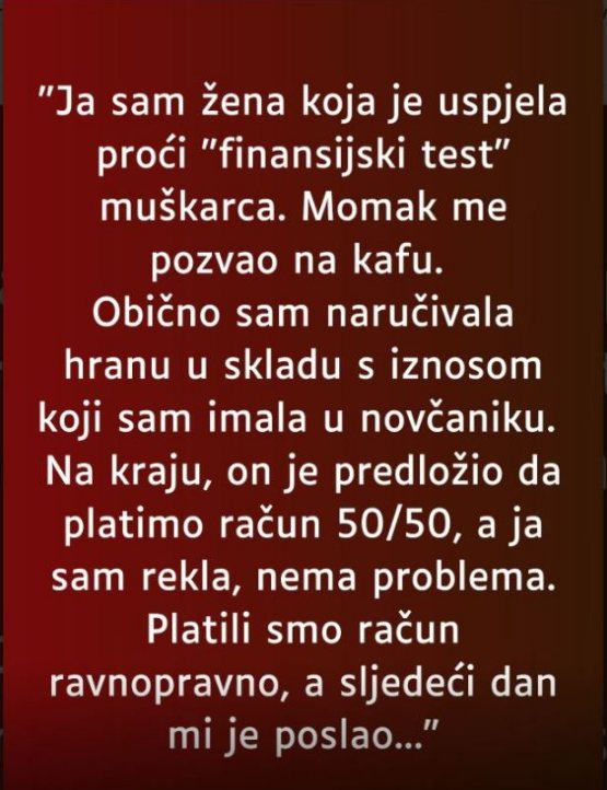 Sve je počelo kao običan prvi sastanak. Djevojka, koja je privukla veliku pažnju na Instagramu, opisuje situaciju sa svog prvog sastanka. Muškarac ju je pozvao na kafu i sve je izgledalo kao tipičan susret. Međutim, kada je došlo vreme za plaćanje, on je izneo predlog da svako plati svoj deo. Umesto da se nađe u situaciji koja bi je možda mogla iznervirati, njen odgovor bio je miran: