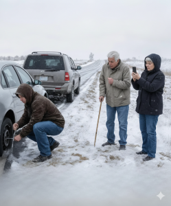 Ipak, naš protagonist nije mogao jednostavno proći pored njih. Vidio je da stariji par drhti od hladnoće, pa je odlučio zaustaviti se i pomoći im. Bio je to trenutak kada je odlučio nešto učiniti, iako nije morao. Pitao je starijeg muškarca treba li pomoć, a on je odgovorio da je pozvao vučnu službu, ali da će čekanje trajati dugo.