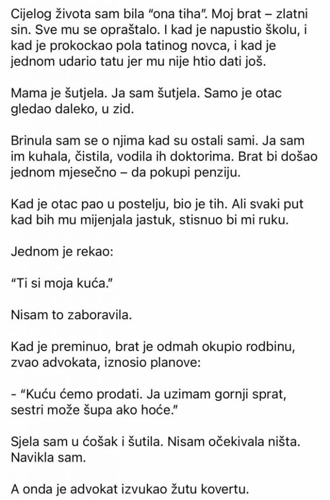 Međutim, tog dana advokat je izvadio žutu kovertu i rekao da mu je otac lično predao tri meseca ranije, uz molbu da se pročita tek posle sahrane. Brat je odmahnuo rukom, uveren da je reč o nekoj formalnosti. Ali dok je advokat čitao, bratov osmeh se gasio rečenicu po rečenicu. U pismu je otac ostavio poruku: ako se ovo čita, to znači da njega više nema. Znao je, pisao je, da će brat pokušati da uzme sve, kao što je uvek činio. Ali ovoga puta to nije moglo. Kuća ne pripada onome ko je mislio da mu sve pripada samim rođenjem. Kuća pripada onome ko je u njoj stvarno živeo. Onome ko ga je nosio kada nije mogao da hoda, hranio kada nije mogao da jede, onome ko ga je grlio kada niko drugi nije želeo da mu pruži ruku.
