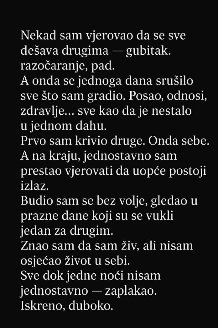 - Shvatio sam da je u redu pasti, da je u redu osećati se slomljeno, ali je najvažnija stvar da nikada ne odustaneš. Jer samo kroz padove rasteš, samo kroz teške trenutke postaješ onaj koji može da se suoči sa svim što život donosi. Svi mi imamo svoje borbe, svoje teške trenutke koje možda nikada ne podelimo sa svetom, ali je važno da se setimo da nismo sami u tome. U tom procesu oporavka naučio sam da postoji nešto mnogo veće od mene, neka snaga koja me vodi, koja me podržava i koja me podseća da, bez obzira na sve, uvek postoji šansa za novi početak.