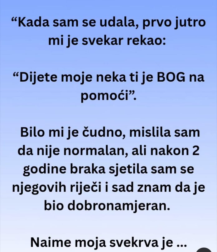 Kada sam se udala, mislila sam da me čeka miran i srećan porodični život, pun ljubavi i razumevanja. Međutim, već prvog jutra nakon venčanja, moj svekar mi je rekao rečenicu koju nikada neću zaboraviti: „Dijete moje, neka ti je Bog na pomoći.“ U tom trenutku nisam shvatila značenje njegovih reči. Pomislila sam da preteruje ili da se možda šali, jer sam bila uverena da me u novoj porodici čeka samo toplina i podrška. Danas, dve godine kasnije, te reči mi odzvanjaju u glavi, ali sada ih razumem na sasvim drugačiji način.