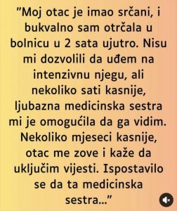 Ova priča počinje jednim od najstrašnijih trenutaka u mom životu. Moj otac je doživeo srčani udar, i u tom trenutku nisam mogla da mislim ni na šta drugo osim da ga što pre vidim. Usred noći, oko 2 sata, otrčala sam u bolnicu. Moje srce je bilo teško, a misli u glavi su se vrtile u haosu. Kad sam stigla, nisam smela da uđem na intenzivnu njegu.