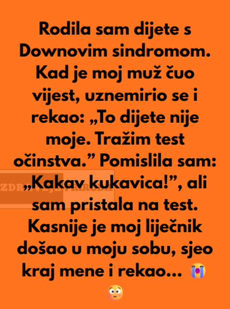 - Dok je majka bila u bolnici, čekajući rezultate testova, ljekar je prišao s ozbiljnim izrazom lica i saopštio nešto što je sve iznenadilo. Ispostavilo se da nije samo sumnja u očinstvo bila razlog za muževu reakciju. Tokom razgovora sa suprugovom majkom, ljekar je otkrio da je muž zapravo bio motiviran brigom za budućnost njihovog djeteta. Nije bio hladan niti ljubomoran, već zabrinut kako će se obezbediti sredstva za sve terapije i posebne potrebe koje će dijete imati tokom svog života. Suprug je bio siguran da bi, kao roditelji, trebalo da preduzmu sve kako bi osigurali detetu kvalitetan život, i to u svim aspektima.