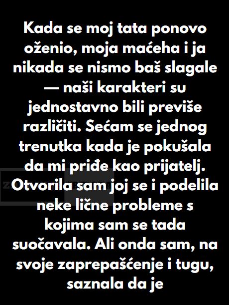 Kada se moj otac ponovo oženio, moj svet se iz korena promenio. U kuću je ušla nova osoba, njegova supruga, moja maćeha. Od samog početka bilo je jasno da se naši karakteri razlikuju. Ona je imala svoje navike, način razmišljanja i energiju, a ja sam, već tada nesigurna i osetljiva, teško podnosila promene. Nisam želela da je potpuno odbacim, ali nikada nismo pronašle zajednički jezik koji bi nas vezao.