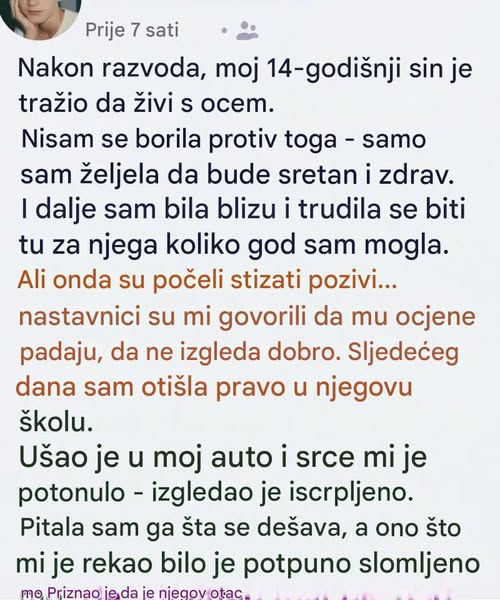 - Marko, mladić koji je prolazio kroz razvod svojih roditelja, odlučio je da živi sa svojim ocem, verujući da će to doneti bliskost i sigurnost. U početku je sve izgledalo ružičasto – šalili su se putem poruka, razmenjivali smešne fotografije i delili male radosti.