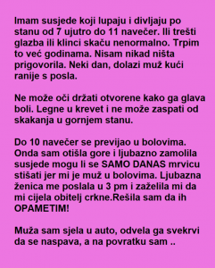 Kada je buka i dalje trajala u deset sati uveče, otišla sam do susjeda. Pokucala sam na vrata sa iskrenom, ljubaznom molbom da budu tiši samo za tu noć, jer je moj muž bolestan. Nisam očekivala previše, ali reakcija žene koja mi je otvorila vrata bila je nešto što nisam mogla da očekujem. Umesto razumevanja, dočekala me je agresivnost – uvrijedila me, psovala i čak mi poželjela smrt cijeloj porodici. Taj trenutak me duboko potresao, ali nisam uzvraćala. Otišla sam, spakovala stvari i odvela muža kod njegove majke, gde je napokon uspio da zaspi u miru.