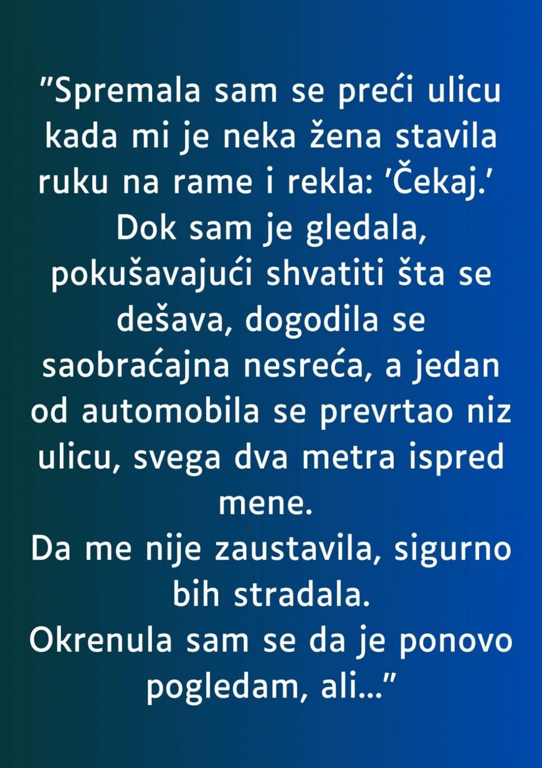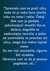 “Da me ona tu nije zaustavila, sigurno bih poginula”, mislila je. Osećala je duboku zahvalnost prema ženi koja je iznenada došla u njen život, ali istovremeno je bila u neverici. Nije imala vremena da je bolje pogleda, ali kada je pokušala da se okrene i potraži je da joj se zahvali, žena je nestala.