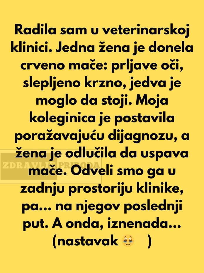 Radila sam u veterinarskoj klinici i, kao i svaki dan, bila sam okružena životinjama koje su prolazile kroz ruke naših stručnjaka. Međutim, jedan događaj je ostavio dubok trag na meni. Jednog dana, žena je donela crveno mače, koje je izgledalo kao da se nalazi na ivici života. Krzno mu je bilo slepljeno, oči prljave i skoro da nije mogao da stoji na nogama. Po dolasku, koleginica je postavila dijagnozu i rekla da mače treba uspavati. Žena je bila slomljena, ali je pristala. Iako smo ga odveli u zadnju prostoriju na njegov poslednji put, nešto me je nateralo da ne verujem u to. Koleginica je iznenada promenila mišljenje i izjavila: „Ne želim to da radim. Hajde da vidimo šta možemo učiniti.“