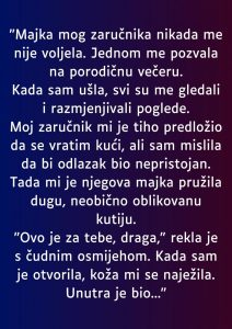 - Osećala je kako joj se koža naježila, shvatajući šta joj majka njenog zaručnika zaista poručuje. Kasnije je čula kako majka, s vidljivim zadovoljstvom, šapuće nekom od gostiju kako bi ona, navodno, mogla da joj pomogne da „nešto uradi sa sobom i svojim kilogramima“. U tom trenutku, duboko povređena, ona je shvatila da nije samo poklon bio problem, već i poruka koju je majka njenog zaručnika želela da joj prenese. Najbolnije je bilo to što njen zaručnik nije reagovao – nijednom rečju nije stao u njenu odbranu.