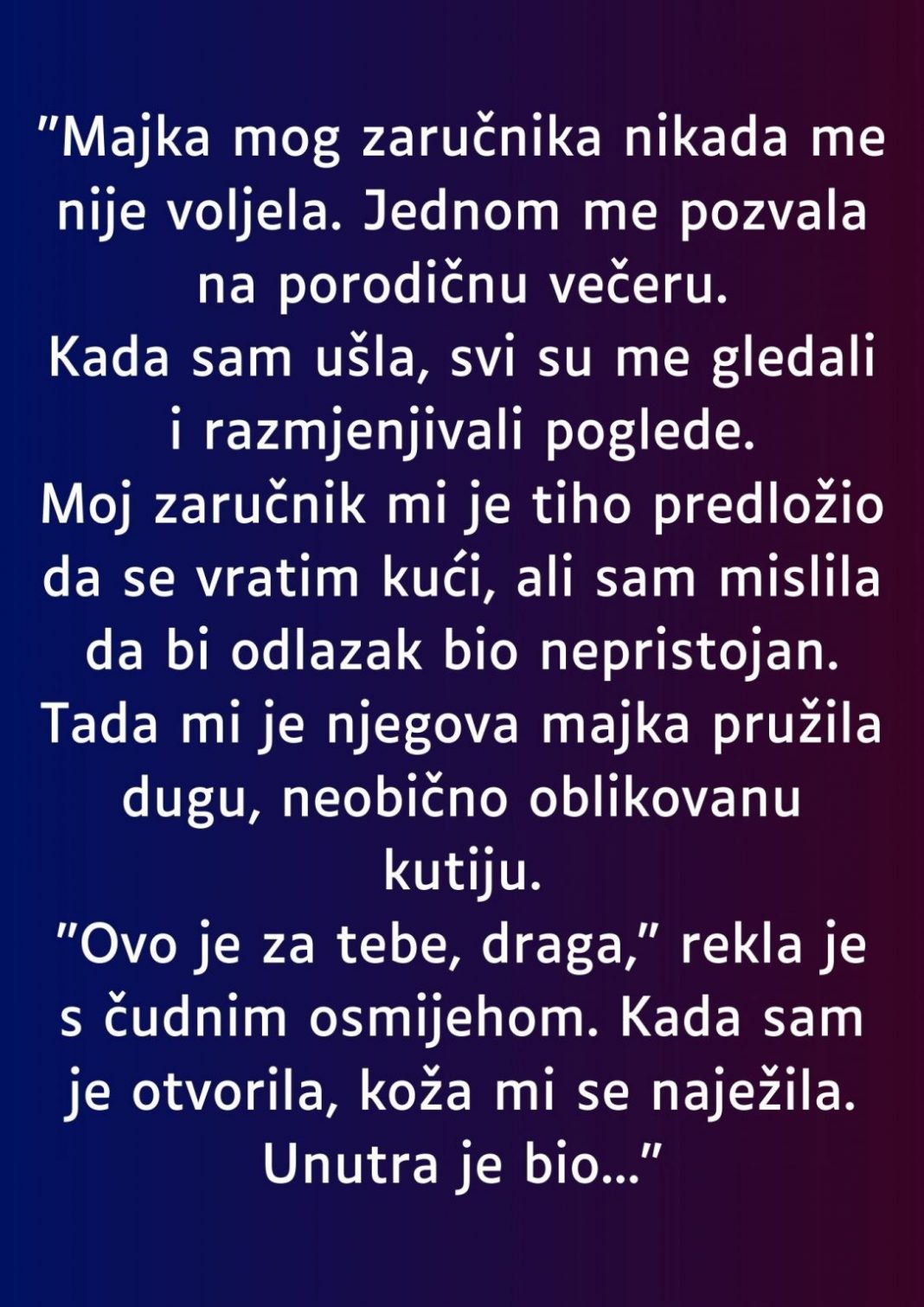 Ovaj tekst nam donosi priču o jednom trenutku kada se nevolja koja je tiho tinjala u pozadini konačno pokazala, a sve je počelo od jedne obične porodične večere.Kada je pozvana na porodičnu večeru, glavna junakinja ove priče nije ni sanjala šta je zapravo čeka. Po dolasku u kuću svog zaručnika, osjetila je da nešto nije u redu.