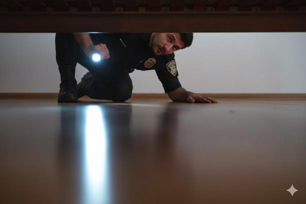 - Nekoliko minuta kasnije, policajci su stigli. Na vratima su ih dočekali roditelji, iznenađeni i pomalo posramljeni. Uveravali su ih da njihova ćerka često izmišlja priče, jer ima bogatu maštu. Ipak, policajci su ostali pri svom – trebalo je proveriti svaku prijavu, ma koliko zvučala neverovatno. Ušli su u devojčicinu sobu i zatekli Miu kako sedi u uglu, stežući svog plišanog medu. Oči su joj bile širom otvorene, a ruke zgrčene od straha. Samo je podigla prst i pokazala na krevet. Šapatom je izgovorila da odatle dolaze zvuci. Jedan policajac se nagnuo i pogledao ispod kreveta. Video je samo razbacane igračke i sloj prašine. Već se spremao da sa osmehom kaže roditeljima da nema nikakve opasnosti, kad se njegov kolega iznenada zaustavio i napeto šapnuo: „Čekaj, čuješ li i ti?“