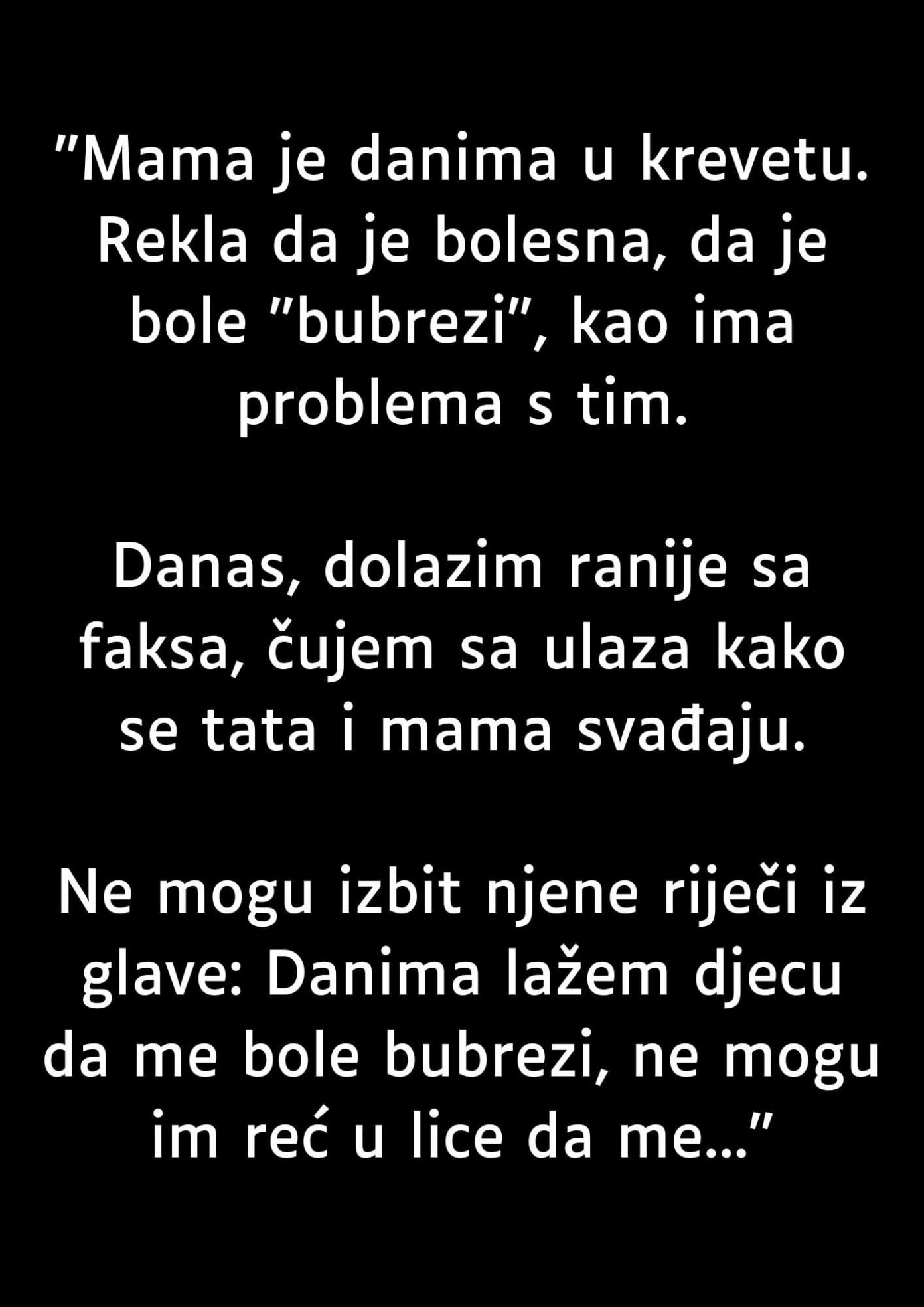 Jednog popodneva, kad sam se vratila ranije sa fakulteta, čula sam raspravu kroz vrata. Glasovi su dopirali iz hodnika, a tek pokojim rečima sam uspela da uhvatim smisao onoga što se govori. U jednom trenutku izmamila je iz mame jedna jeziva rečenica koju ne mogu da izbacim iz glave: govorila je kroz jecaje i suze da već danima laže decu pričom o bolnim bubrezima, jer ne može otvoreno reći da ju je njihov otac prisilio da prekine trudnoću. Rekla je da on ne želi više od dvoje dece i da ne želi da u kući bude dečiji plač u ovom trenutku. Te reči su padale kao kamen, svaka od njih bolnija od prethodne.