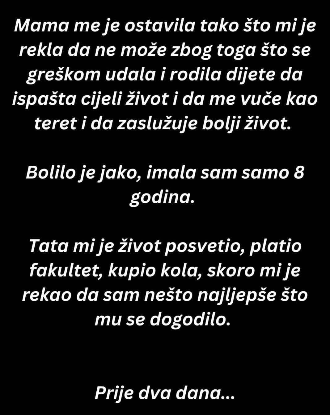 Tata je bio moj heroj. Radio je dva posla da bih mogla da studiram, da imam sve što mi je potrebno i da nikada ne osetim manjak ljubavi. Kupio mi je prvo auto, pomogao mi da pronađem stan i nikada mi nije dozvolio da se osetim manje vrednom zbog toga što nemam majku. Često bi rekao da sam njegovo najveće postignuće i da sam mu vratila veru u život. I onda, pre samo dva dana, dogodilo se nešto što je ponovo otvorilo sve rane za koje sam mislila da su davno zarasle. Na vratima mog stana pojavila se ona — moja majka. Nisam je prepoznala odmah, prošlo je više od dvadeset godina. Izgledala je starije, umornije, oči su joj bile pune suza. Rekla je da ju je muž izbacio iz kuće, da nema gde da ode, da nema novca i da joj je potrebna pomoć.