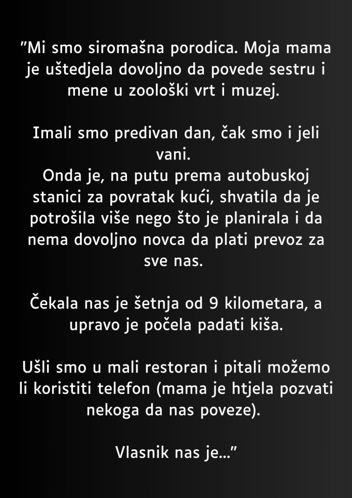 Priča o ljudskoj dobroti počinje u jednoj skromnoj porodici koja se svakodnevno suočava sa životnim izazovima. Iako nismo imali mnogo, moja majka je uspjela svojim trudom i odricanjem da uštedi dovoljno novca za jedno posebno putovanje koje će ostati urezano u našim srcima. To putovanje nije bilo samo fizičko, već je imalo duboko emotivno značenje koje nas je naučilo vrednosti humanosti i solidarnosti. Naučili smo ne samo kako da se nosimo sa teškoćama, već i kako da prepoznamo i cenimo male, ali dragocene trenutke sreće.