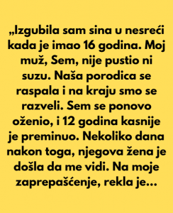 Prošlo je nekoliko godina, a bol nije nestajala. Naučila sam živjeti s njom, ali nikada nisam preboljela. Moj bivši muž ponovo se oženio, a naš kontakt je postao gotovo nepostojeći. Međutim, iznenađenje koje mi je donijela vijest o njegovoj smrti promijenilo je sve. Nisu mi slali nikakve obavijesti, ali nakon njegove smrti javila mi se njegova druga supruga. Razgovor koji smo imale promijenio je cijeli moj pogled na prošlost. Otkrila mi je da moj bivši muž nije bio biološki otac mog sina. Taj trenutak bio je poput udarca, jači od svega što sam prošla.