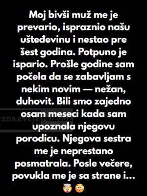 - Nakon osam meseci veze, njen partner je pozvao da upozna njegovu porodicu, što je izazvalo mešavinu uzbuđenja i nervoze. Ovaj poziv značio je ozbiljnost njihove veze i činjenicu da partner ceni njeno prisustvo u svom životu. Prvi susret s njegovom porodicom bio je ispunjen toplinom i ljubaznošću, ali i neizvesnošću. Iako su je roditelji srdačno dočekali, sestra njenog partnera bila je zbunjena, što je izazvalo dodatnu nesigurnost. Na tom susretu, žena je shvatila koliko su okolnosti ponekad nepredvidive i koliko je svet mali. Nakon što je sestra partnera diskretno upitala o njenom bivšem suprugu, žena je doživela šok. Između nje i prošlih iskustava stvorila se iznenadna veza, jer je bivša partnerka sada bila u braku sa njenom bliskom prijateljicom. Iako je bila iznenađena, shvatila je da njena prošlost ne mora oblikovati njen sadašnji život. Ovaj susret joj je omogućio da otvoreno razgovara i razmeni iskustva sa prisutnima, čime je dodatno ojačala sebe.