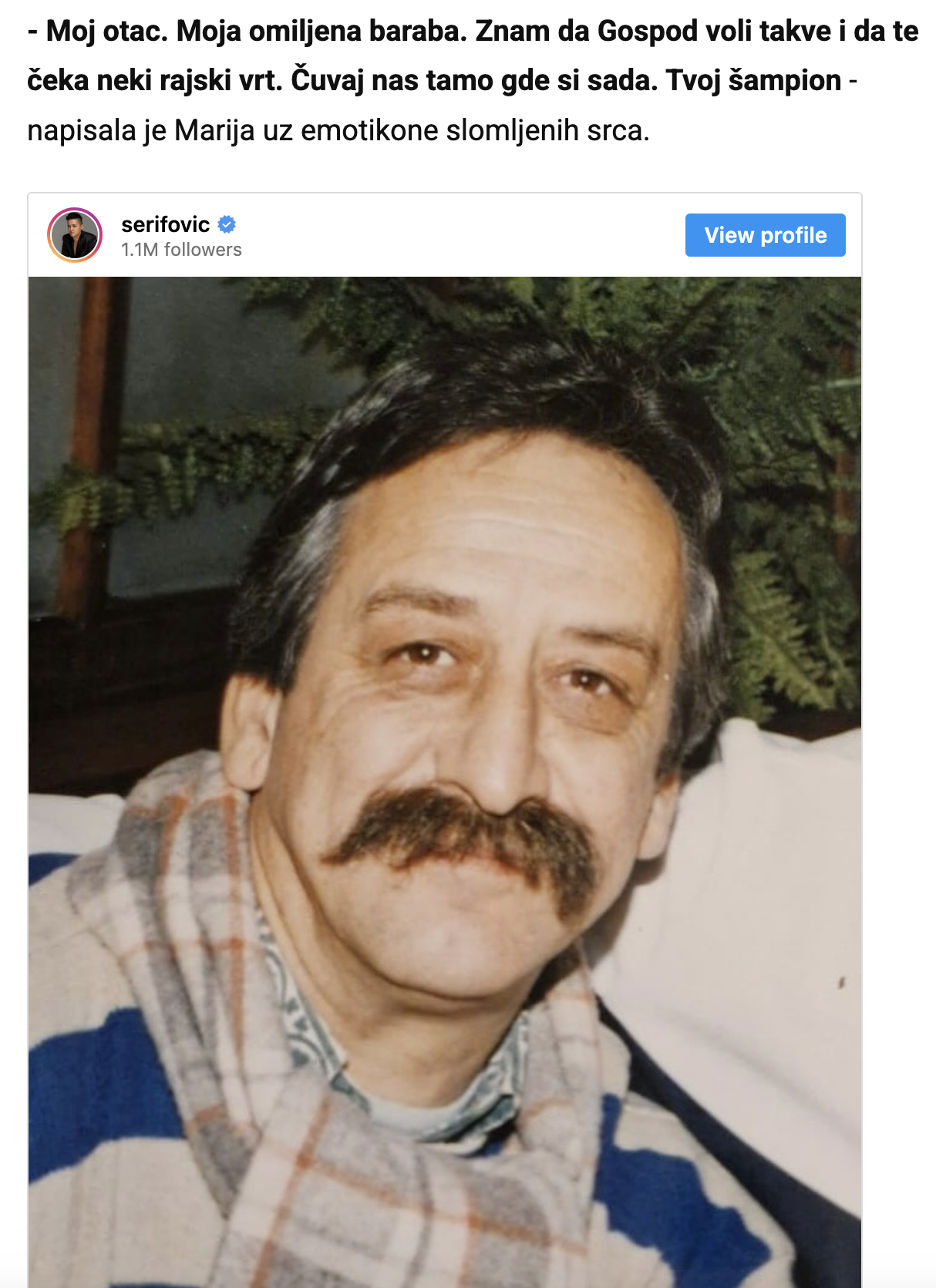 Marija Šerifović oglasila se nakon smrti svog oca Rajka Šerifovića, koji je preminuo u bolnici u Kragujevcu nakon kraće bolesti. Smrt oca duboko je pogodila poznatu pevačicu, a na društvenim mrežama podelila je emotivnu poruku u kojoj se oprostila od svog voljenog roditelja. Marija je uz njegovu fotografiju napisala: “Moj otac. Moja omiljena baraba. Znam da Gospod voli takve i da te čeka neki rajski vrt. Čuvaj nas tamo gde si sada. Tvoj šampion.” Iako je pokušavala da zadrži emotivnu kontrolu, njene reči jasno pokazuju koliko je bio važan u njenom životu.