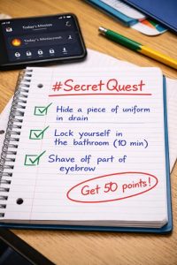 - Na početku su to bili bezopasni zadaci – doći u školu sa različitim čarapama, ne pričati cijeli dan, skriviti u ruksaku neku poruku i ne uhvatiti se. Ali, zadaci su postajali sve čudniji. Zatvoriti se u kupatilu na određeno vreme, zaprljati deo školske uniforme i pokušati to sakriti. Stvoriti “tajnu” o kojoj ne možeš pričati roditeljima.