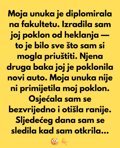 Moja unuka je nedavno diplomirala, a povodom toga sam joj izradila poklon od heklanja. To je bilo sve što sam si mogla priuštiti, ali dala sam svoj maksimum. Dok je njena druga baka kupila potpuno novi automobil, moj poklon je bio skroman, ali od srca. Nažalost, moja unuka nije ni primijetila moj trud. Osjećala sam se zanemareno i pomalo bezvrijedno, pa sam odlučila otići ranije, skrivajući svoju tugu. Gledajući je kako se veseli automobili, osjećala sam se kao da moj poklon nije imao nikakvu težinu, kao da nisam uspjela učiniti dovoljno.