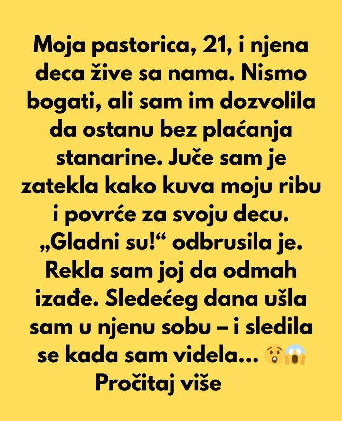 Moja pastorica, koja ima 21 godinu, i njena deca žive sa nama. Iako nismo bogati, dozvolila sam im da ostanu kod nas bez potrebe da plaćaju stanarinu, jer sam želela da im pomognem. Ipak, juče sam naišla na nešto što me potpuno zateklo. Kada sam ušla u kuhinju, videla sam je kako sprema moju ribu i povrće za svoju decu. “Gladni su!” rekla je, u očiglednoj žurbi, bez imalo stida. Moje srce se steglo. Poželela sam da joj kažem da odmah napusti moj dom, i učinila sam to.