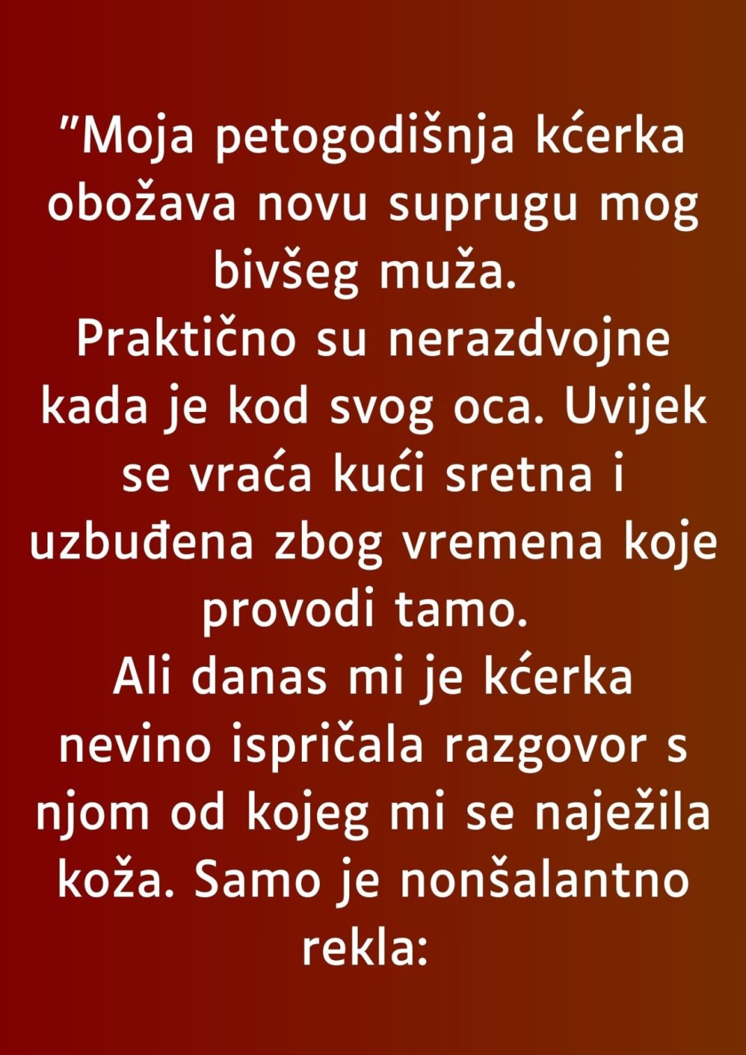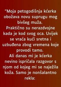 Ova priča o tome kako je nova supruga mog bivšeg muža postala uzor mojoj petogodišnjoj kćerki, govori o snazi ljubavi i prihvatanja, te o tome koliko je važno ostati otvoren za nove početke.Kada je moja kćerka prvi put srela novu suprugu mog bivšeg muža, bila sam iznenađena koliko su brzo stvorile vezu. Sećam se njihovog prvog susreta, koji je bio uobičajena poseta, ali s nečim što nije bilo obično.