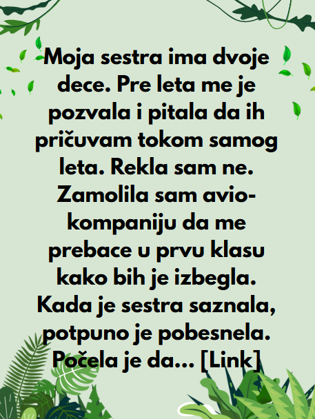 - Tvoj izbor da kupiš kartu u prvoj klasi, i to kako si to isplanirala, pokazuje tvoju želju da postaviš sebi granice i da sebi omogućiš odmor i udobnost, a to je potpuno u redu. S obzirom na sve što si već prošla, sasvim je razumljivo da nisi želela da tokom leta budeš opterećena dodatnim obavezama, posebno s obzirom na činjenicu da je sestra već u prošlosti ostavljala decu na tvoju odgovornost. To što si donela tu odluku, iako je to moglo izazvati napetost, bilo je tvoje pravo da se pobrineš za svoje potrebe.