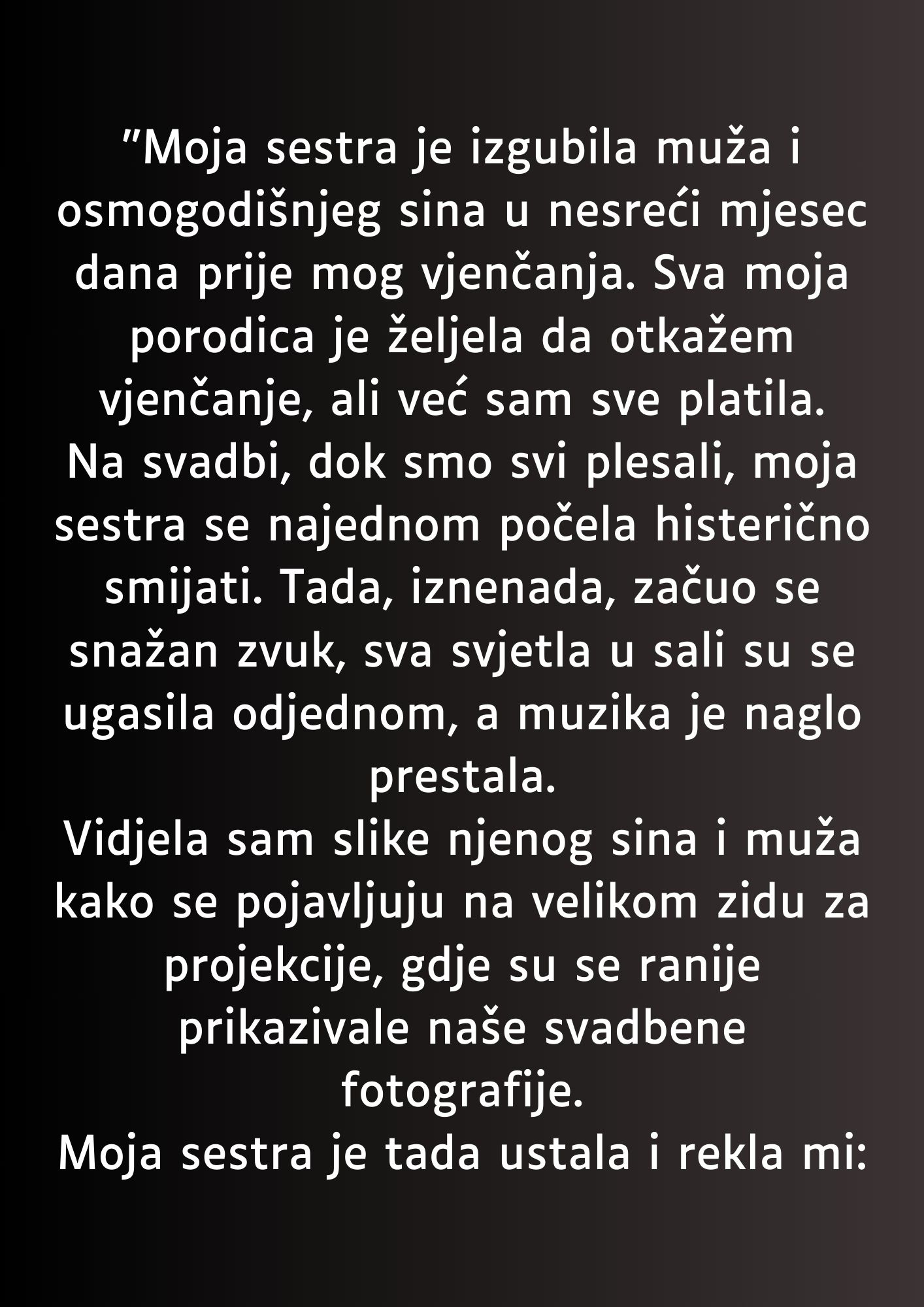 Svi koji su prisustvovali svadbi te žene bili su zatečeni i šokirani njenom sestrinim ponašanjem. Na svadbi, dok su svi veselili i plesali, došlo je do neočekivane scene. Sestra, koja je nedavno izgubila muža i osmogodišnjeg sina u tragičnoj nesreći, iznenada je počela histerično smejati. I dok su svi bili u neverici, iznenada su se ugasila svetla, muzika je stala, a na velikom zidu za projekcije pojavile su se slike njenog preminulog muža i sina. To je bio trenutak potpune tišine i zapanjenosti.