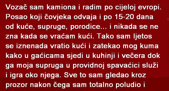 Jedan kamiondžija ispričao je svoju bolnu sudbinu. Godinama radi posao koji ga vodi po celoj Evropi, daleko od porodice i doma. Po 15 ili 20 dana provodi na putu, nikada ne znajući kada će se tačno vratiti. Upravo ta neizvesnost i odsustvo stvorili su teren za najtežu izdaju u njegovom životu. Jednog letnjeg dana odlučio je da se ranije vrati kući, bez najave. Ono što je zatekao za kuhinjskim stolom zauvek mu je promenilo život. Kroz prozor je video prizor koji ga je slomio – njegov kum, u donjem vešu, sedi i večera, dok ga njegova supruga, odevena u prozirnu spavaćicu, poslužuje i koketno igra oko njega.