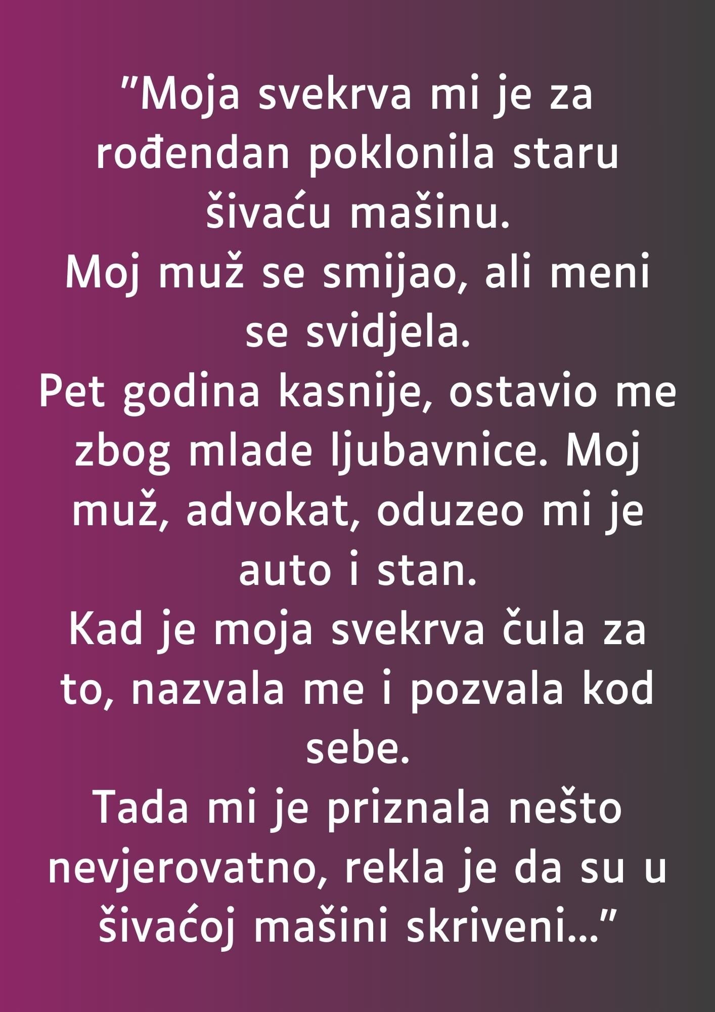 - Nekoliko meseci nakon razvoda, svekrva me pozvala kod sebe. Na trenutak sam pomislila da će razgovor biti pun tuge i sećanja na prošlost, ali ono što mi je ispričala potpuno me iznenadilo. Otkrila mi je da su pravi dijamanti, koje je nasledila, zapravo bili sakriveni u šivaćoj mašini koju mi je poklonila. Ovi dijamanti nisu bili samo vredni u materijalnom smislu, već su predstavljali i emocionalnu baštinu njene porodice. Moja svekrva je naglasila da je njena baka bila ta koja je ostavila ovu dragocenost. Tajna koja je bila skrivena sve ove godine promenila je moj pogled na poklon i na sve što sam mislila da znam o svojoj svekrvi.