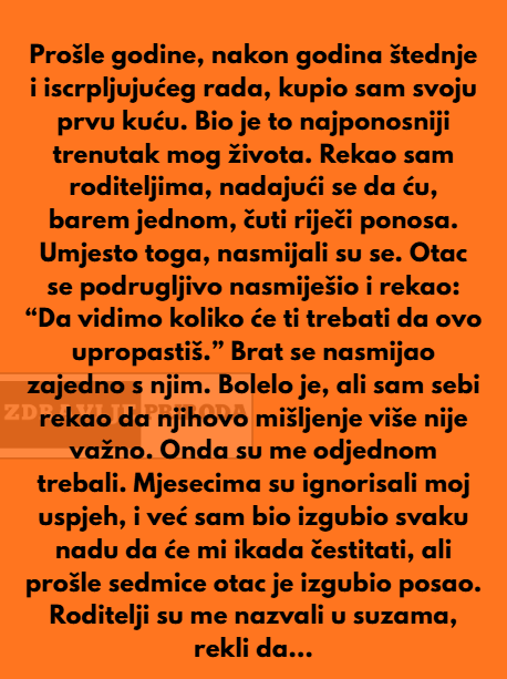 Nakon toga, njihovo ponašanje se nije mijenjalo. Iako sam postigao nešto na što sam bio izuzetno ponosan, njihova indiferentnost prema mom uspjehu je ostala. Ipak, sve se promijenilo prošle sedmice. Moj otac je izgubio posao, a roditelji su me nazvali uplakani, govoreći da nemaju gdje da odu. Tada su me pitali mogu li se useliti kod mene. Kuća koju su ranije ismijavali sada je postala jedina opcija koju su imali.