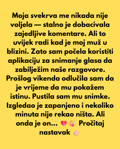 Vremenom sam počela da osećam sve veći pritisak. Svaki susret s Jane bio je emocionalno iscrpljujuć, a ja sam izlazila iz njene kuće sa knedlom u grlu. Činilo mi se da ne postoji način da dokažem mužu šta se zapravo dešava, jer ona nikada nije pokazivala svoje pravo lice pred njim. On bi je video samo kao brižnu, pomalo napornu, ali dobronamernu majku. Ja sam, s druge strane, imala osećaj da se borim s osobom koja je vešto naučila da skriva svoje prave namere. Pre oko mesec dana, sve je kulminiralo tokom jedne posete njenoj kući. Tog dana je prešla svaku granicu. Napadala je sve što radim – od mog načina kuvanja, preko mog posla, pa čak i mog izgleda. Svaka njena rečenica bila je obavijena lažnim osmehom i slatkim tonom, ali u suštini otrovna. Pokušala sam da ostanem mirna, ali sam u sebi osetila da više ne mogu ovako. Tada mi je palo na pamet da jedini način da dokažem istinu jeste da je zabeležim.