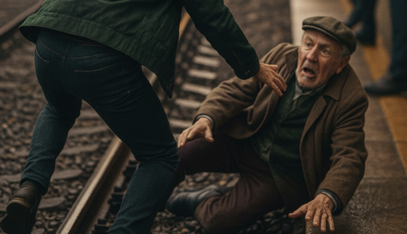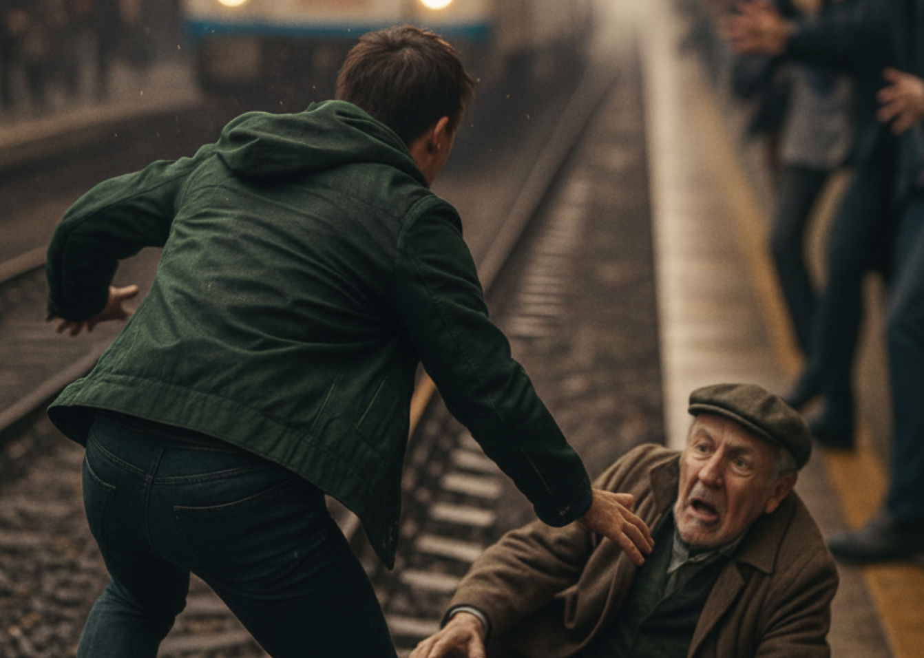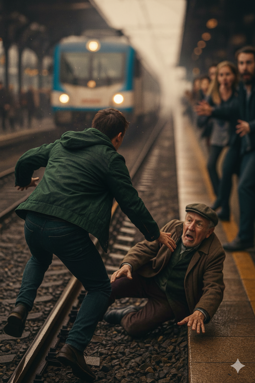 U tim sekundama, dok su pogledi svih prisutnih bili prikovani za starca koji je ležao na šinama, muškarac u jakni nije napravio pauzu. Nije se dvoumio. Nije pogledao oko sebe tražeći da li će neko drugi reagovati. Samo je skočio. U trenu se našao dole, pored starca, koji je pokušavao da se pomjeri, ali mu noga nije dozvoljavala. Zavukla se između šina i nekog metalnog držača, a panika mu je oduzela snagu. Pogledi prisutnih mogli su samo da gledaju kako muškarac u jakni kleči u šljunku, pokušava da zgrabi starca za ramena i podigne ga, dok se u pozadini čula buka nadolazećeg voza koja je rušila svaku nadu da ima dovoljno vremena.