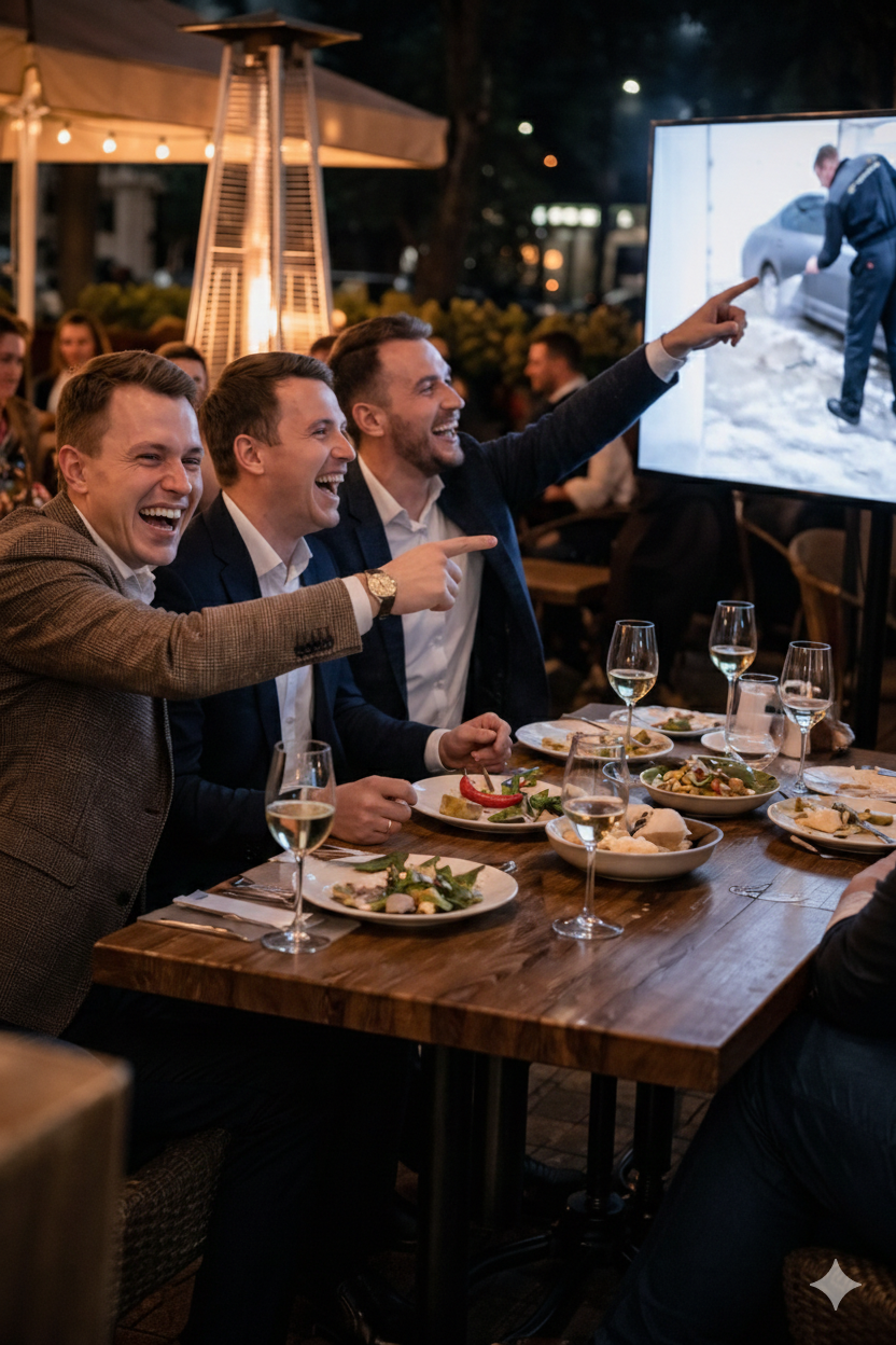 Međutim, ništa što su gledaoci mogli zamisliti nije bilo u pravoj igri. Dok su smeh i podsmevanje bili u punom jeku, nešto se desilo. Preko terase restorana je stao luksuzni crni njemački SUV. Do tada je sve izgledalo kao još jedan običan dan, ali sada je stigao – isti onaj koji je bio „mójžič“, samo sada u skupocenom odelu, izgledajući kao da je upravo stigao sa poslovnog sastanka. Njegov izgled je odmah izazvao tihu tišinu u prostoriji.