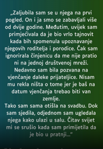 - Dok je sjedila na svadbenom slavlju, iznenada je ugledala svog partnera kako ulazi u salu. Srce joj je stalo. Bio je u društvu jedne predivne žene, a njihova bliskost bila je očigledna. On joj je šaputao nježne riječi na uho, a ona ga je ljubila pred svima. U tom trenutku, cijeli svijet ove žene se srušio. Mislila je da je sve u redu, da je imala povjerenja u njega, ali očigledno je da je bila prevarena. Osjećaj izdaje bio je neizdrživ, pa je odlučila napustiti svadbeni party.