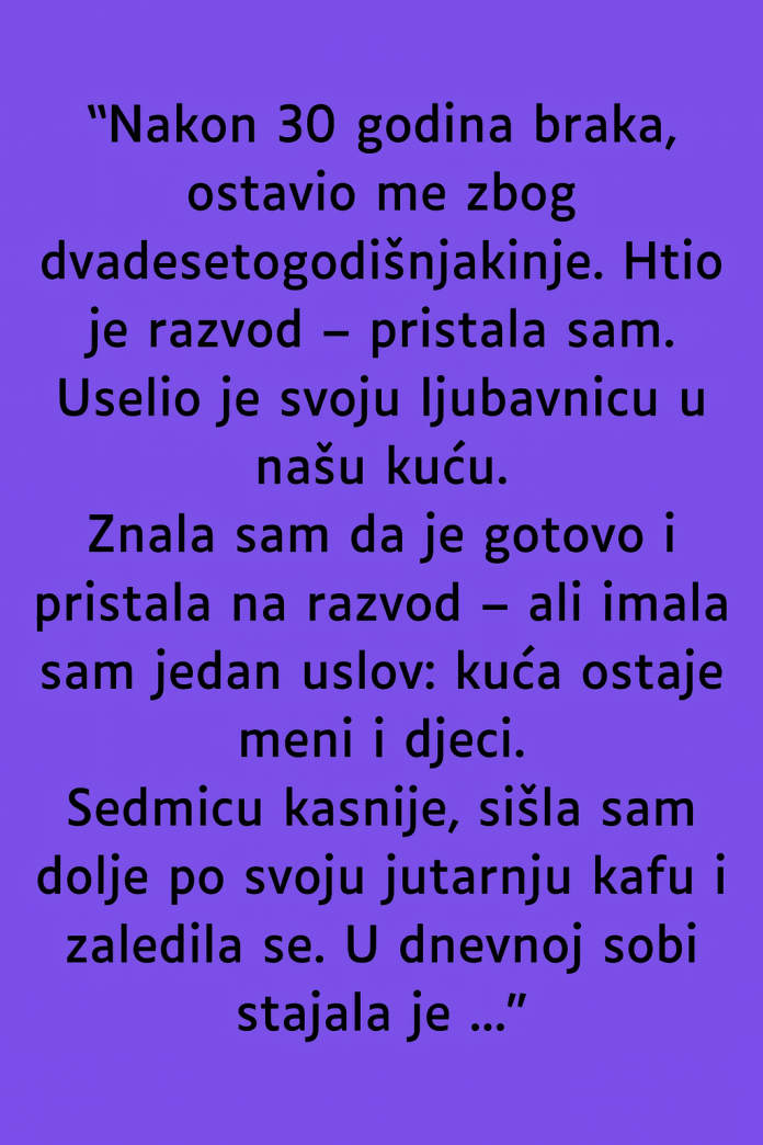 Nekoliko dana kasnije, jedno obično jutro, koje je Margaret započela kao i svako drugo, postalo je trenutak koji neće moći da zaboravi. Išla je niz stepenice po svoju prvu kafu, kad je zastala u šoku. U dnevnoj sobi je bila gomila kofera i torbi, postavljenih kao da se neko upravo uselio. U sledećem trenutku začula je smijeh mlade djevojke koju je muž doveo u njihov dom, djevojke zbog koje je ona ostavljena. Taj trenutak je sve objasnio — njihov plan nije bio samo da je zamijene u njegovom životu, nego i u njenoj kući.