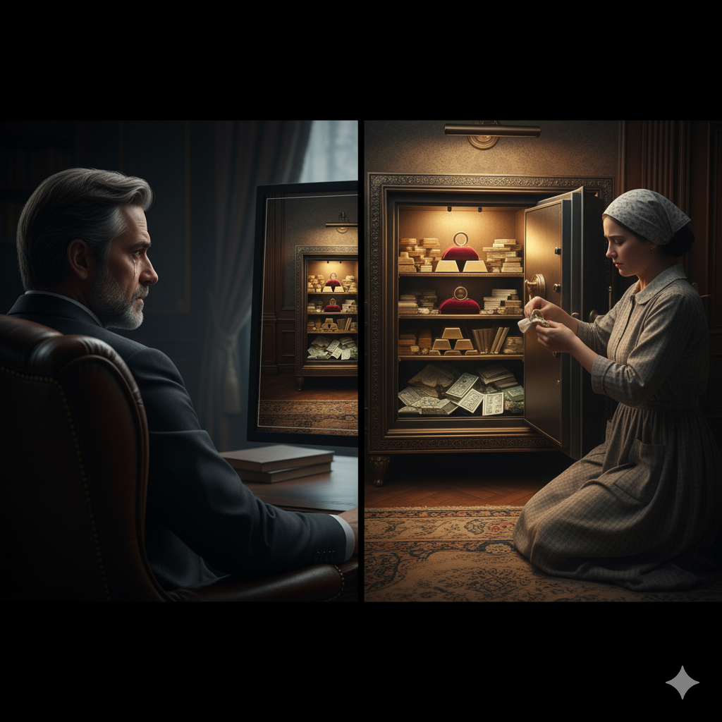 - Njene oči su se u tom trenutku zaustavile na sefu, na kojem su ležali svežnjevi novca, zlatnici i nekoliko dragocenih safira. Maria je polako prišla sefu i zaustavila se na vratima. David je zadržao dah, prateći svaki njen pokret kroz skrivenu kameru. Umesto da uzme bilo koji od tih dragocenosti, Maria je počela čistiti prašinu sa ivica sefa. S njezinim smirenim pokretima, sve je delovalo kao deo rutine. Ni najmanje nije pokazivala interes za novac i vrednosti pred njom. Umesto toga, bila je posvećena svom zadatku čišćenja. Zatvorila je sef, pažljivo proverivši je li sve sigurno, i uzela ključeve koje je pronašla na stolu.